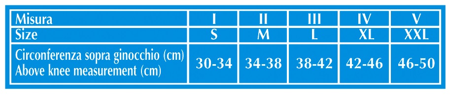 Elastična opornica za koleno, z odprtino. Za izbiro prave velikosti izmerite obseg nad kolenom in številko primerjajte v tabeli.