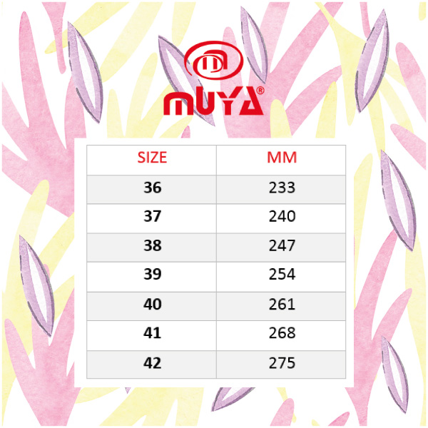 Muya ima udobje športnega copata, zato so primerni za dolgo nošenje. Ti anatomski podplati enakomerno porazdelijo telesno težo in omogočajo udobno gibanje. Posebej oblikovan lateks vložek, ki preprečuje potenje, je primeren za vse vrste stopal in zagotavlja zdrav in mehak korak.